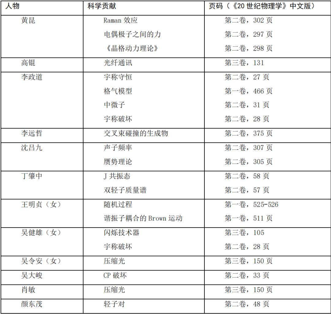 由上述統計可以發現,除楊振寧外,《20世紀物理學》一書中還提到了上述12位華人物理學家的工作,涉及5個物理學領域。