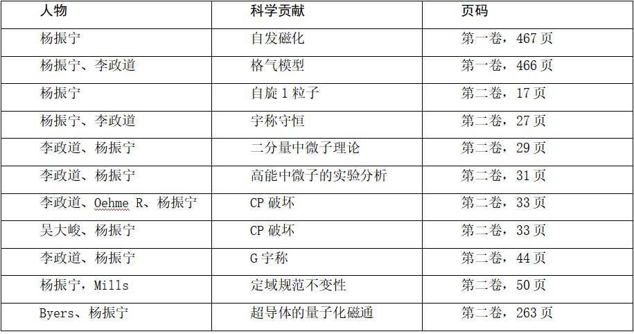 表1:《20世紀物理學》中楊振寧學術成果一覽。