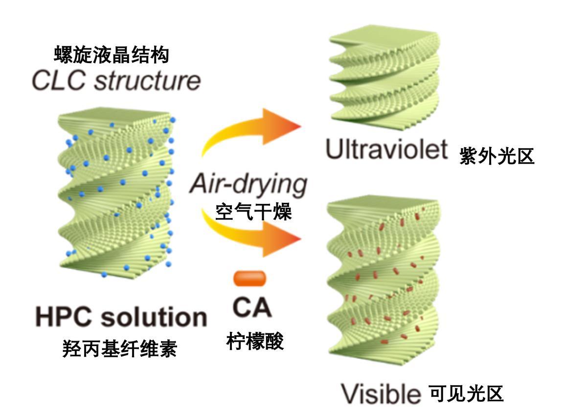 他們以羥丙基纖維素(HPC)爲基體,引入了檸檬酸(CA)。這種物質可食用、可生物降解、且能提供多重氫鍵,能夠在乾燥過程中“支撐並鎖定”手性液晶的螺旋節距,使顏色在固態下依然明亮,並且可隨配方線性調諧,覆蓋整個可見光譜。