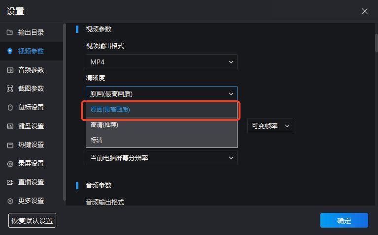 在視頻參數界面中,用戶不僅可以調整視頻的清晰度,還能設置視頻的輸出格式、幀率、視頻分辨率等參數,在這裏可以對錄屏的細節處進行更加細節的設置,完成後點擊【確定】。