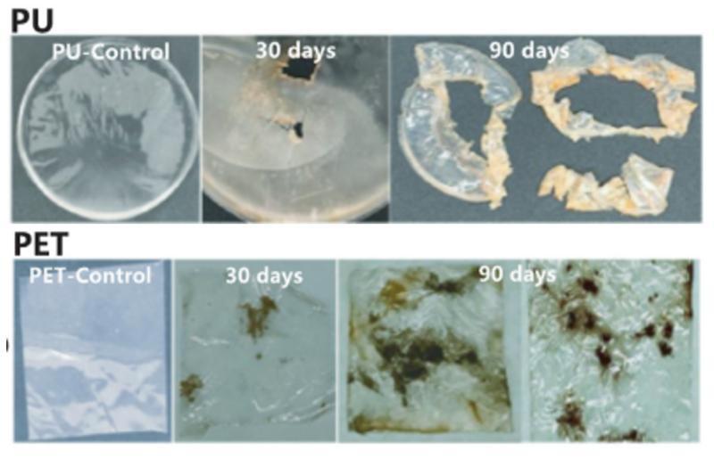 F.vanettenii真菌作用90天發生生物降解的PU薄膜和PET薄膜