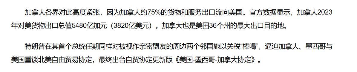 這對加拿大來說,難以承受,因爲加拿大簡直是美國的經濟附庸國。美聯社報道,加拿大超過75%的出口流向美國,嚴重依賴單一市場的結果是什麼,就是美國對中國加徵高關稅,中國大不了不做美國生意,還可以出口歐盟、日韓、東盟以及一帶一路沿線國家,而加拿大不行,加拿大沒有替代市場,所以美國對加拿大加徵高關稅,對加拿大來說就是天塌了。