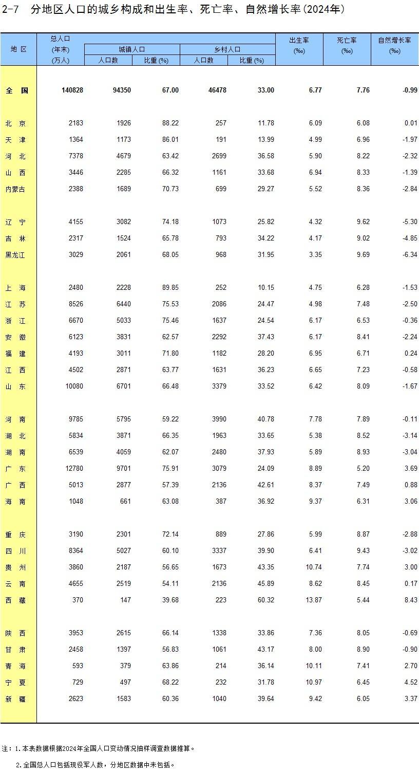 2025年10月27日,國家統計局公佈了全國31個省份2024年的出生率數據。總體來說,全國平均出生率爲6.77‰,比平均死亡率7.76‰低了0.99個千分點。
