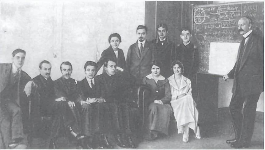 圖說:1916年A.F.約費(A. F. Ioffe)研討會上的6位參與者合影(這張照片是卡皮察(P. L. Kapica)用自拍器拍攝的)。坐着的人從左到右依次是:P. L. 卡皮察(P. L. Kapica)、J. I. 弗倫克爾(J. I. Frenkel'')、N. N. 謝苗諾夫(N. N. Semenov)、K. F. 涅斯圖爾赫(K. F. Nesturch)、P. I. 盧基茨基(P. I. Lukitskij)、I. K. 玻爾(I. K. Bohr)、M. V. 米洛維多娃-基爾皮喬娃(M. V. Milovidova-Kirpiceva);站着的人從左到右依次是:J. R. 斯米亞特-切爾內舍娃(J. R. Smiat-Cernyseva)、N. I. 多布朗拉沃夫(N. I. Dobronravov)、A. P. 尤先科(A. P. Jusčenko)、J. G. 多爾夫曼(J. G. Dorfman);黑板旁的是A. F. 約費(A. F. Ioffe)。