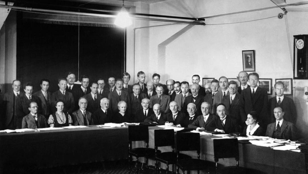 圖說:1933年10月下旬舉行的第七屆索爾維會議(Solvay conference)匯聚了理論物理學家與傑出化學家。本次會議由保羅·朗之萬(Paul Langevin)主持,主題爲原子核的結構與性質,在比利時布魯塞爾的布魯塞爾自由大學(Free University of Brussels)舉行。與會者包括:克拉默斯 (H. A. Kramers)、斯塔赫爾 (E. Stahel)、約里奧 (F. Joliot) 、海森堡 (W. Heisenberg)、費米 (E. Fermi)、薛定諤 (E. Schrödinger)、約里奧夫人 (Mme. I. Joliot,即伊雷娜·約里奧-居里)、玻爾 (N. Bohr)、莫特 (N. F. Mott)、狄拉克 (P. A. M. Dirac)、沃爾頓 (E. T. S. Walton)、約費 (A. Joffe)、居里夫人 (Mme. Curie)、伽莫夫 (D. Gamow) 、布萊克特 (P. Blackett)、埃雷拉 (J. Errera)、玻恩 (M. Born)、德布羅意 (M. de Broglie)、理查森 (O. W. Richardson)、唐德爾 (Th. De Donder)、科桑 (M. Cosyns)、勞倫斯 (E. Lawrence)、佩爾斯 (R. Peierls)、邁特納 (Mlle. L. Meitner)、查德威克 (J. Chadwick)。約費和伽莫夫是來自蘇聯的參會者,伽莫夫自那之後就永遠離開了蘇聯。