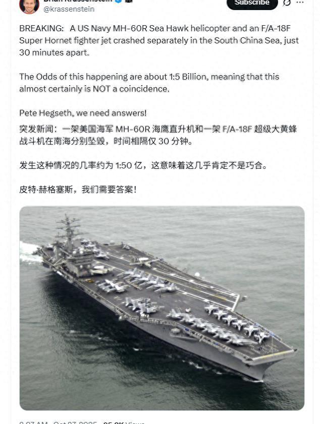 媽耶,美軍又墜機了,還是2架,還是在南海墜機,還是在30分鐘內接連摔了2架。這摔機效率可比印度強多了,我個人猜測啊,這次墜機可能和特朗普不發軍餉有關。
