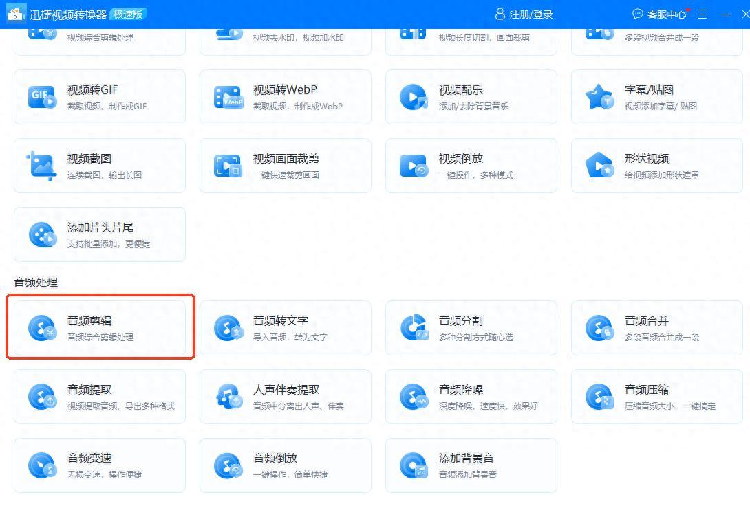 打開軟件,在首頁找到【音頻剪輯】,支持批量剪輯,可以導入多個音頻。