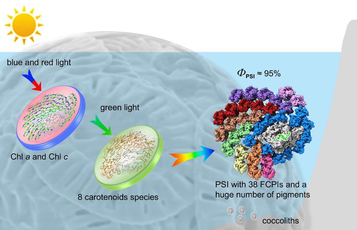 研究結果則表明,這個超複合體在光能捕獲和能量傳遞環節的量子效率高達 95%。換句話說,在 100 個光子進入這套系統後,有 95 個的能量能被順利傳遞到反應中心並轉化爲電子。顆石藻的光系統 I的這一轉化效率水平,遠高於許多陸地植物的同類系統。