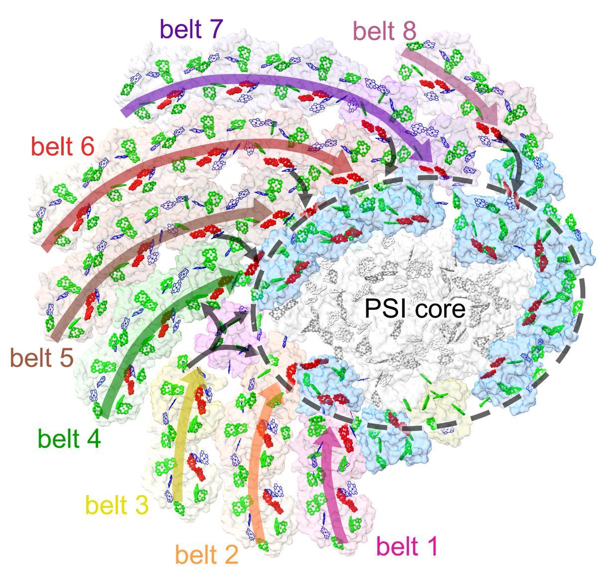 顆石藻PSI外的捕光天線條帶,箭頭標示出了主要的能量傳遞途徑