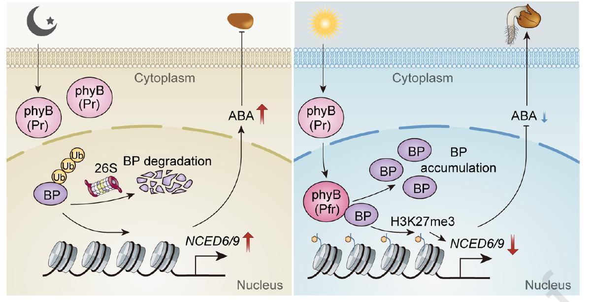當光照激活phyB後,phyB會與BP結合,使BP不容易被分解。這樣,BP就能夠在細胞中積累到足夠的量,開始發揮調控作用。進一步的實驗結果表明,BP能夠抑制與脫落酸(ABA)合成相關的基因表達,從而降低ABA水平。
