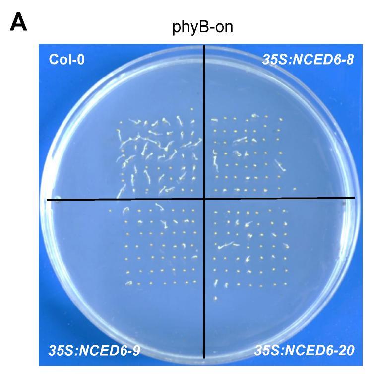 在擬南芥中過量表達ABA合成基因NCED6後,ABA過量合成,導致擬南芥的萌發被抑制,但ABA未過量合成的對照組(Col-0)則正常萌發