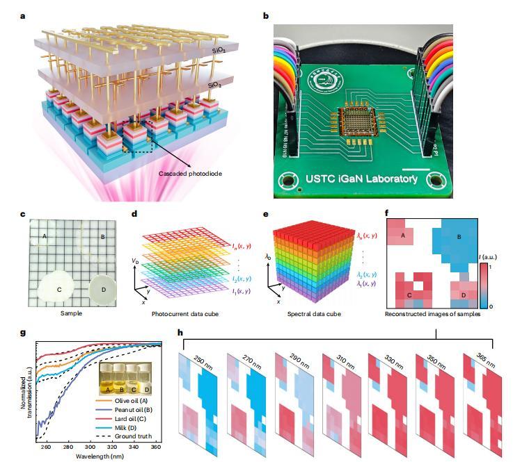 這項技術的創新之處在於,它不依賴傳統的幾何分光與機械掃描,而是基於氮化鎵(GaN)基垂直級聯n-p-n光電二極管陣列,結合深度神經網絡算法,實現了高精度光譜探測與高分辨率多光譜成像。