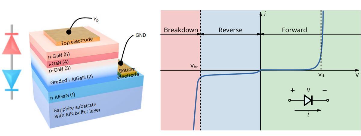 垂直級聯n-p-n光電二極管結構示意圖(左)及二極管的電流-電壓特性曲線(右)