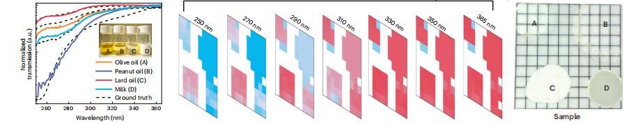 爲驗證成像儀芯片的性能,iGaN團隊利用其對橄欖油(A)、花生油(B)、動物油(C)和牛奶(D)四種有機物液滴進行了光譜成像,並通過其在紫外波段的吸收特性,清晰呈現出四種材料的空間分佈及透射特性,測試結果與商用光譜儀高度一致,空間分辨率高達300μm×300μm,進一步驗證了光譜成像芯片的可靠性。
