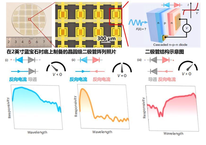 在零偏壓狀態下(V=0),當入射光爲波長較短時,電子-空穴對主要由底部二極管產生;當入射光波長較長時,底部與頂部的二極管均能產生電子-空穴對,但由於兩個二極管方向相反,兩組電子-空穴對會相互抵消,最終器件僅保留對短波長光的窄帶響應。