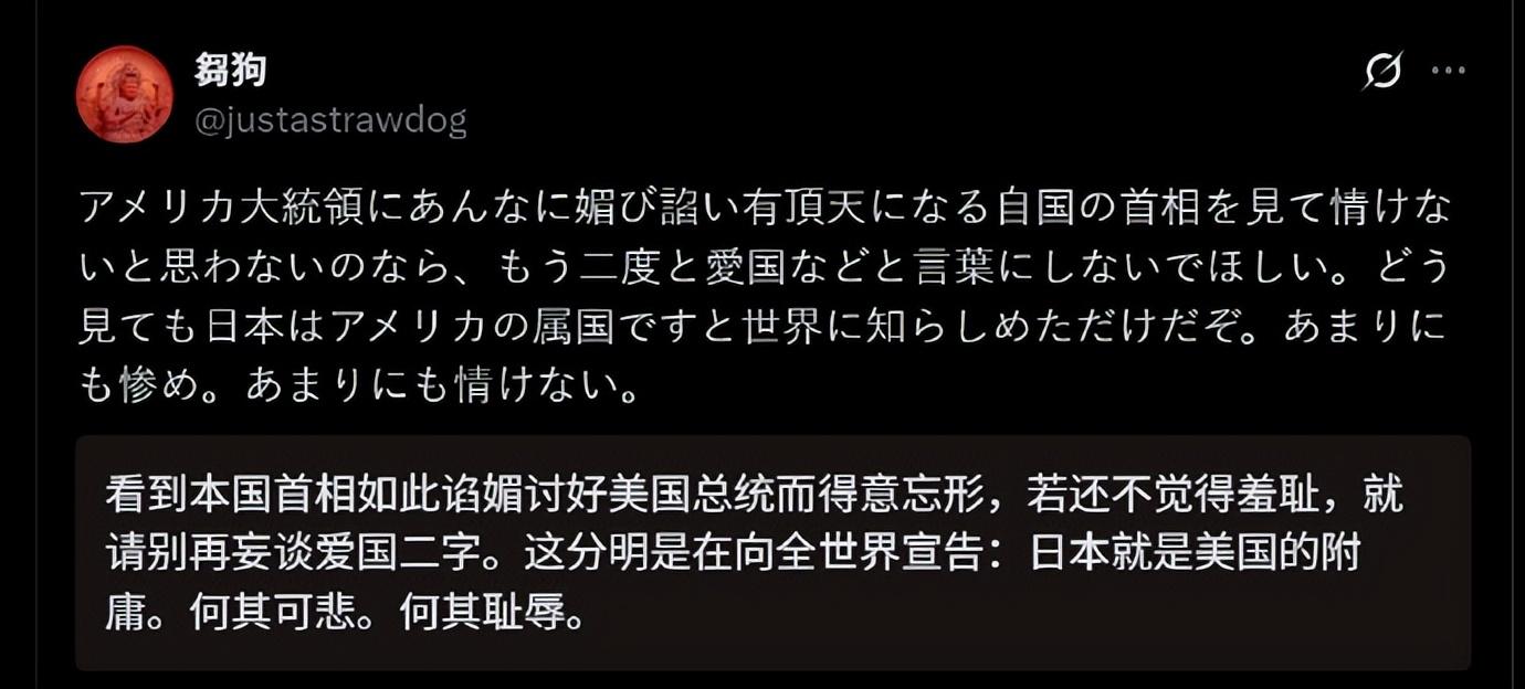 看到首相如此諂媚的討好美國總統而得意忘形,若還不覺得羞恥,就請別再妄談愛國二字,這分明是向全世界宣告,日本就是美國的附庸。
