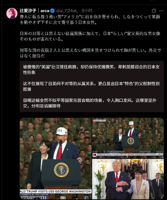 日本民衆說,被傲慢的美國壯漢摟住肩膀,卻仍保持優雅微笑、卑躬屈膝迎合的日本女性形象,這不僅展現了美日間不平等的從屬關係,更凸顯出日本特色的父權制性別圖景,這哪裏是外交,分明是諂媚接待。