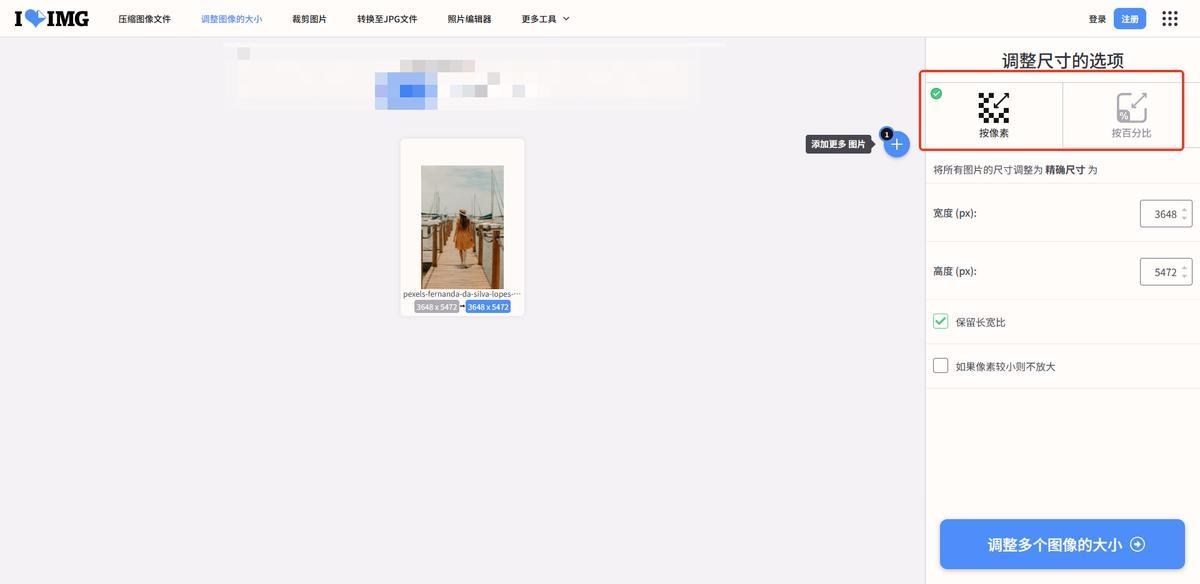一款在線圖像處理平臺,擁有圖片調整大小、圖片壓縮和轉換等多種功能,它支持用戶上傳照片後按像素和百分比來修改尺寸,在按照像素修改尺寸中可以自定義設置圖片的寬度和高度,完成後保存圖片即可。