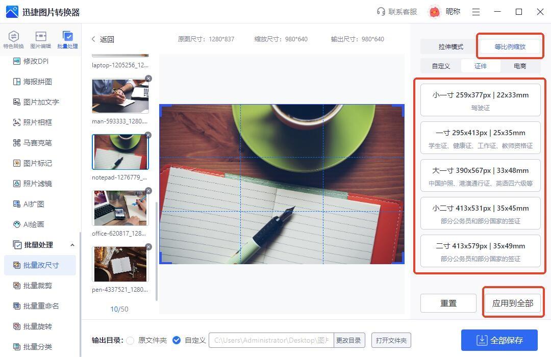 導入多張圖片後,在【證件】中找到“駕駛證”的尺寸,即可爲當前圖片設置適合駕駛證的尺寸,然後點擊【應用到全部】,即可爲所有照片設置成駕駛證的尺寸,整個過程簡單方便,無需擔心手動輸入錯誤。