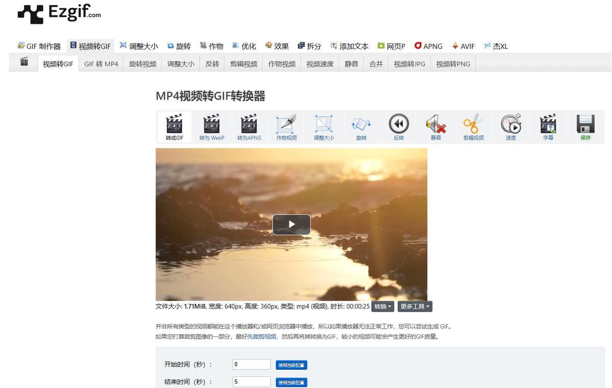 一個功能齊全的在線GIF處理站點,它可以直接製作GIF,也可以將視頻轉爲GIF,在轉換的過程中支持對GIF進行細節處的設置,包括GIF時長、尺寸等,設置之後點擊【轉換爲GIF】即可。