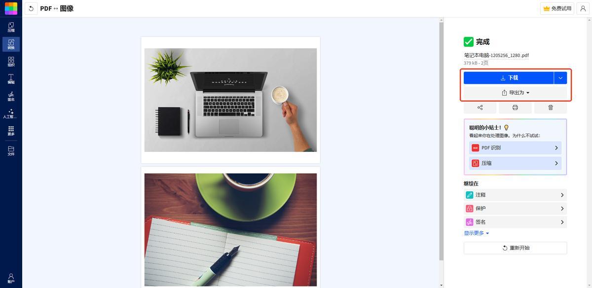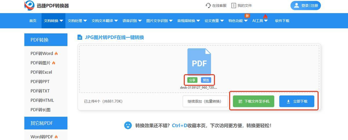 稍等一會,網站就會快速將多張jpg轉爲PDF格式,在這裏可以預覽和分享該PDF,還能立即下載以及掃碼下載文件。