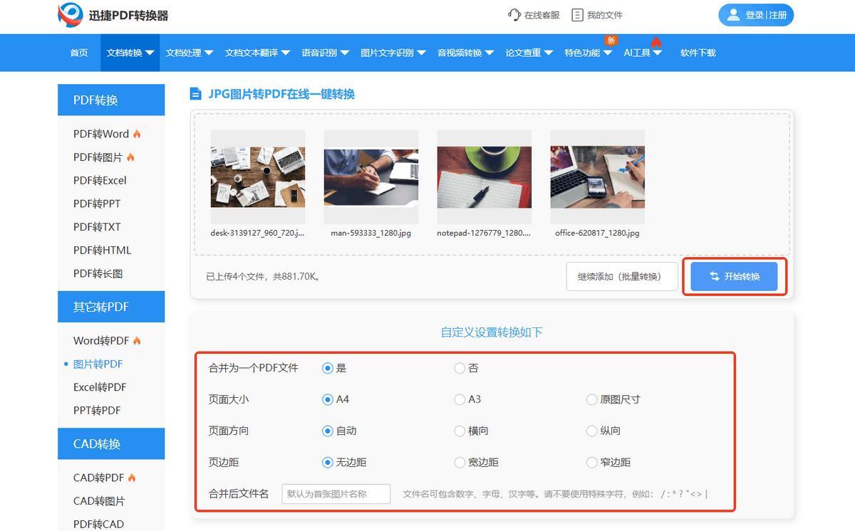 上傳圖片後可自動識別並排列順序,生成的PDF支持自定義頁邊距和紙張方向,方便用戶後續使用,設置完成後點擊【開始轉換】。