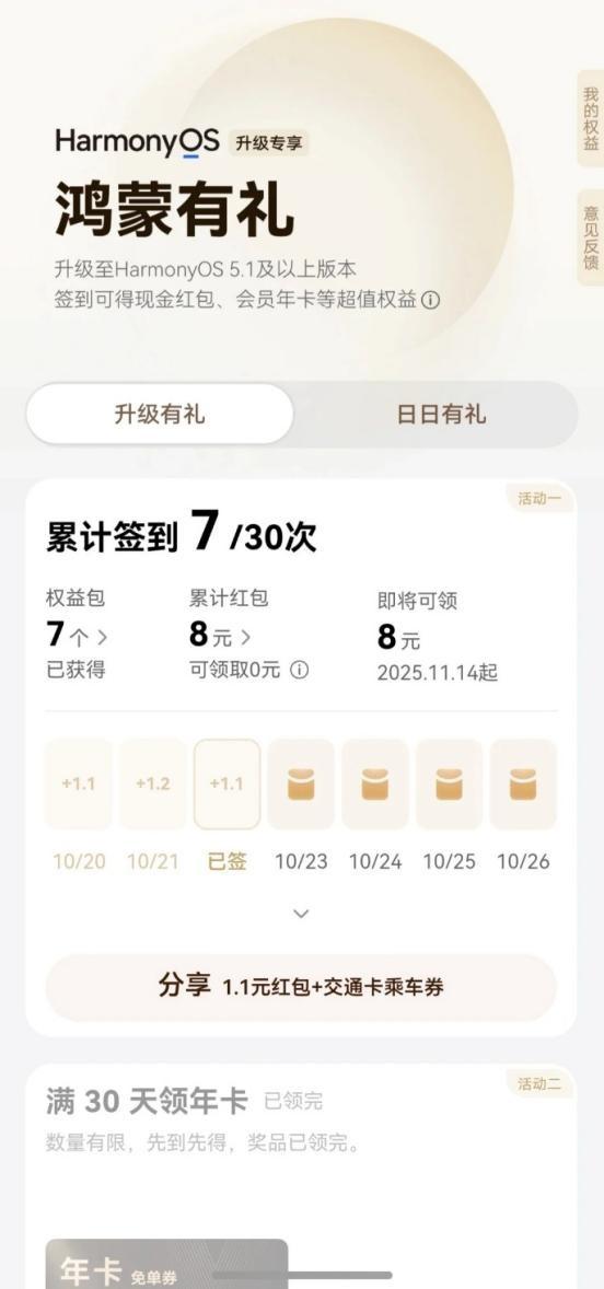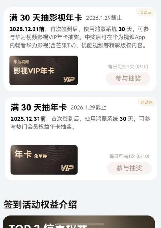 最關鍵的是,我本以爲,這每天簽到領福利的活動持續30天,我的“羊毛之旅”就差不多了。結果前兩天點進去一看,鴻蒙有禮又上新活動了:抽年卡免單券!