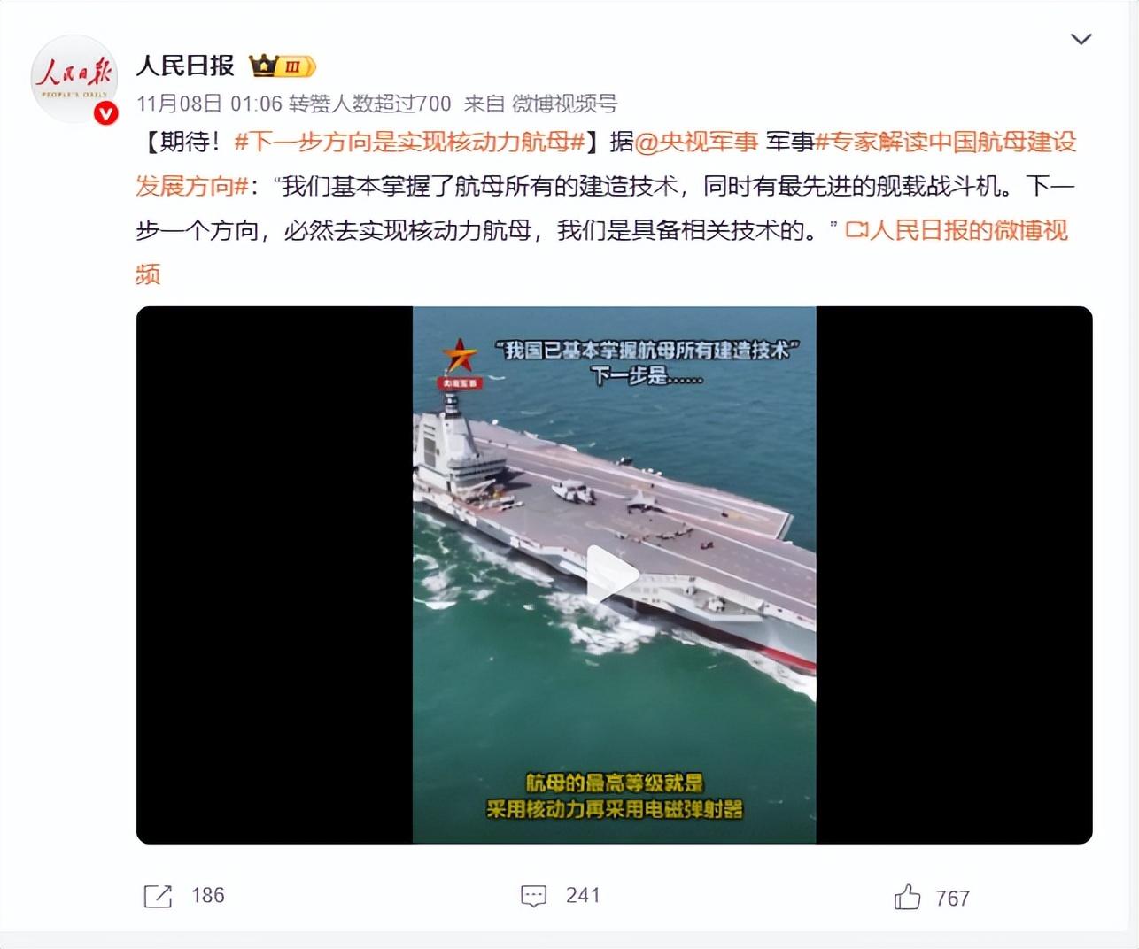 當然了,00型航母還不是咱們的終極目標,咱們下一步的方向就是核動力+電磁彈射。我看美媒報道說,中國可能已經在建了,說美國國防承包商提供的衛星圖像顯示,大連造船廠可能在爲一艘核動力航母建造實驗分段。如果是真的話,那意味着中國真的已經走向星辰大海。