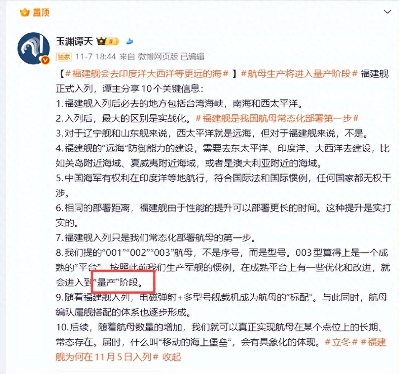 其次,003型航母算是成熟的平臺,按照慣例,以後咱們將會在成熟平臺上優化和改進之後,就會進入到量產階段。量產意味着啥,意味着技術成熟,意味着福建艦的建造,已經培養了一大批的熟練工,那我國的第四艘、第五艘航母就快了,甚至可能兩艘同時開造。