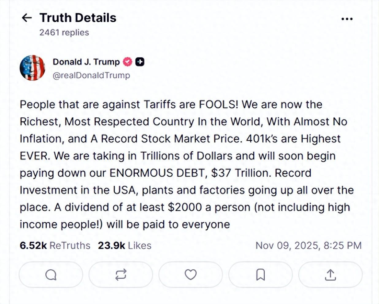特朗普嘛,一天三百個主意,一看情況對自己不利,立馬說要撒錢籠絡人心,但是,他只是嘴皮動一動,財長貝森特可是要真掏錢啊,他立馬就去打哈哈了,後來特朗普也刪了推文,明眼人一看也知道這很不靠譜。