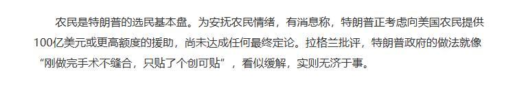 其次,特朗普得罪了自己的鐵票倉農民,或喪失農業州的選票。特朗普跟咱們打貿易戰,結果咱們不買美國大豆了,雖然現在又恢復購買了,但是特朗普的政策切切實實的損傷了農民的利益。