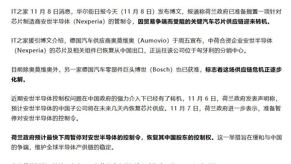 荷蘭也是,怎麼能創出如此塌天大禍啊,沒實力還硬搶我們的安世半導體,理由是根據美國50%穿透性規則,結果美國都跟中國和談了,荷蘭還在這嘴硬,最後實在是扛不住了,荷蘭政府才發表聲明稱,預計安世半導體的中國子公司,將在未來幾天內恢復芯片供應。11月7日,荷蘭政府進一步表示,準備暫停對安世半導體的控制令。