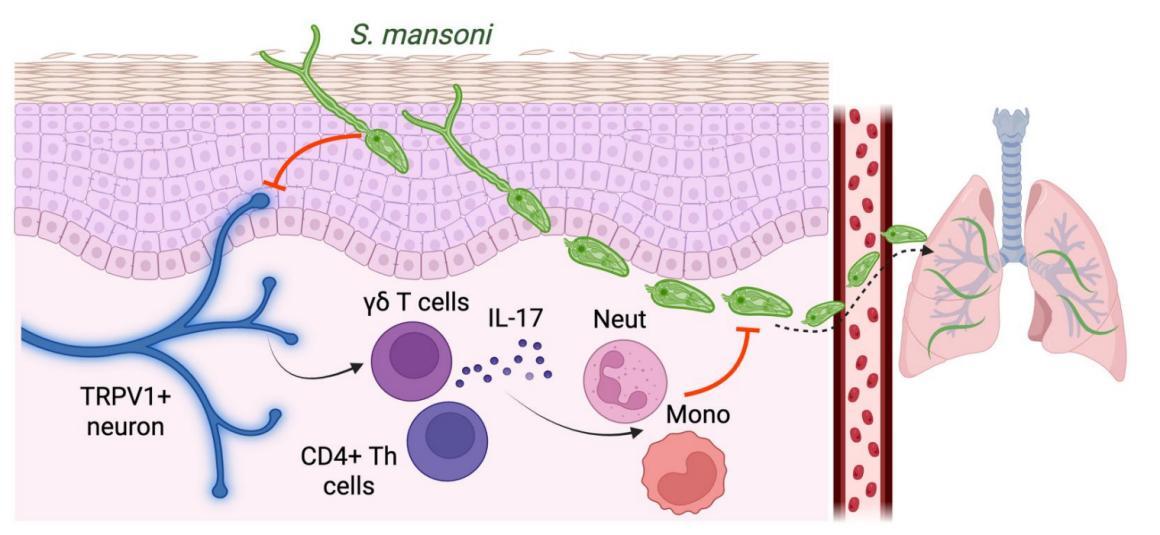 TRPV1⁺ 神經元在抵禦曼氏血吸蟲皮膚侵入時的作用