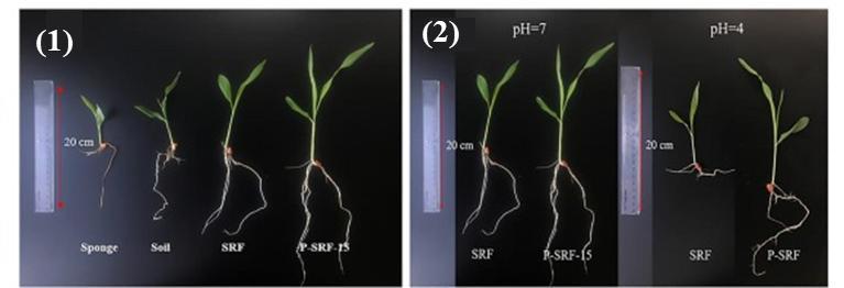 圖3 玉米幼苗在(1)乾旱土壤和(2)不同pH值下生長21天后的數碼照片。