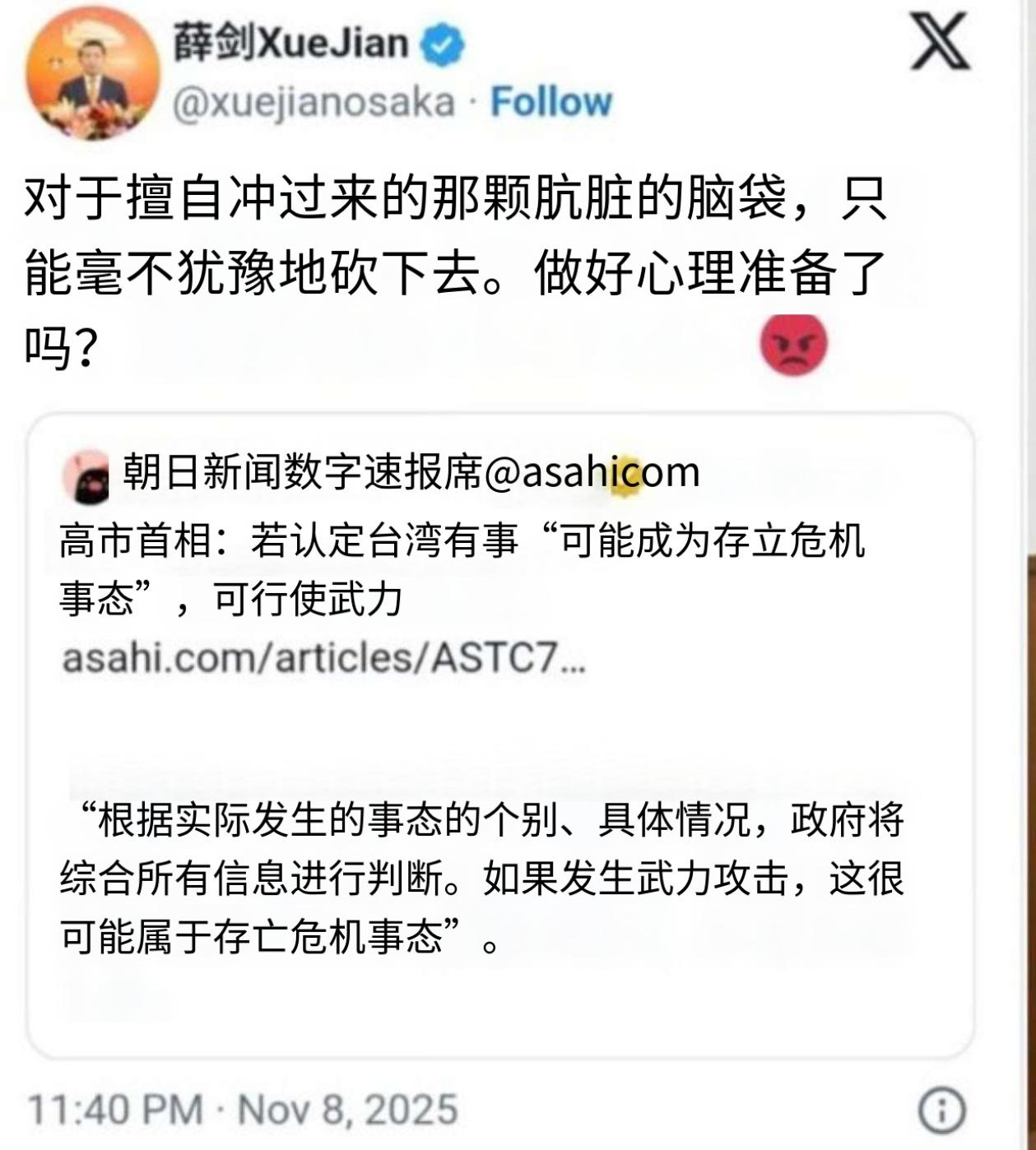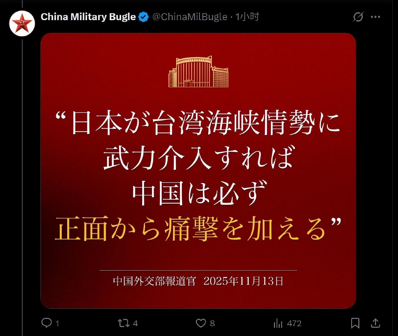 所以說,高市早苗的那句“臺灣有事”,可能構成日本可行使,集體自衛權的“存亡危機事態”,這已經不是在暗示了,而是在赤裸裸的向中國人民發出武力威脅。