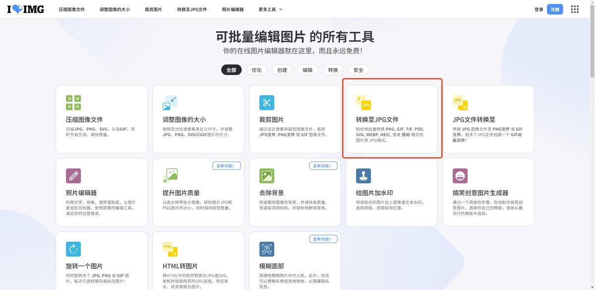 只需要在首頁點擊【轉換至JPG文件】,導入webp,點擊轉換按鈕即可將webp轉換成JPG圖片。