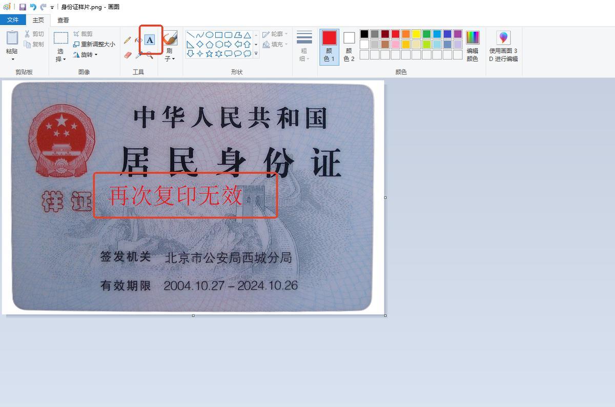 Windows自帶的圖片編輯工具,可以用來爲身份證添加文字水印,操作也不難,只需要通過畫圖打開身份證照片,點擊【文本】,在圖片上合適的位置添加內容,還能設置文字的顏色、字號,完成後保存即可。