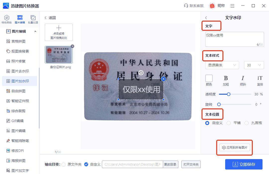 一款專業的圖片處理軟件,不僅支持圖片格式轉換,還可以爲多張圖片同時添加水印,一次可以導入30張圖片。我們可以用它來爲身份證圖片添加文字水印,還能自定義字體、顏色、透明度和位置,而且軟件在本地運行,無需上傳敏感證件照,保障隱私安全。