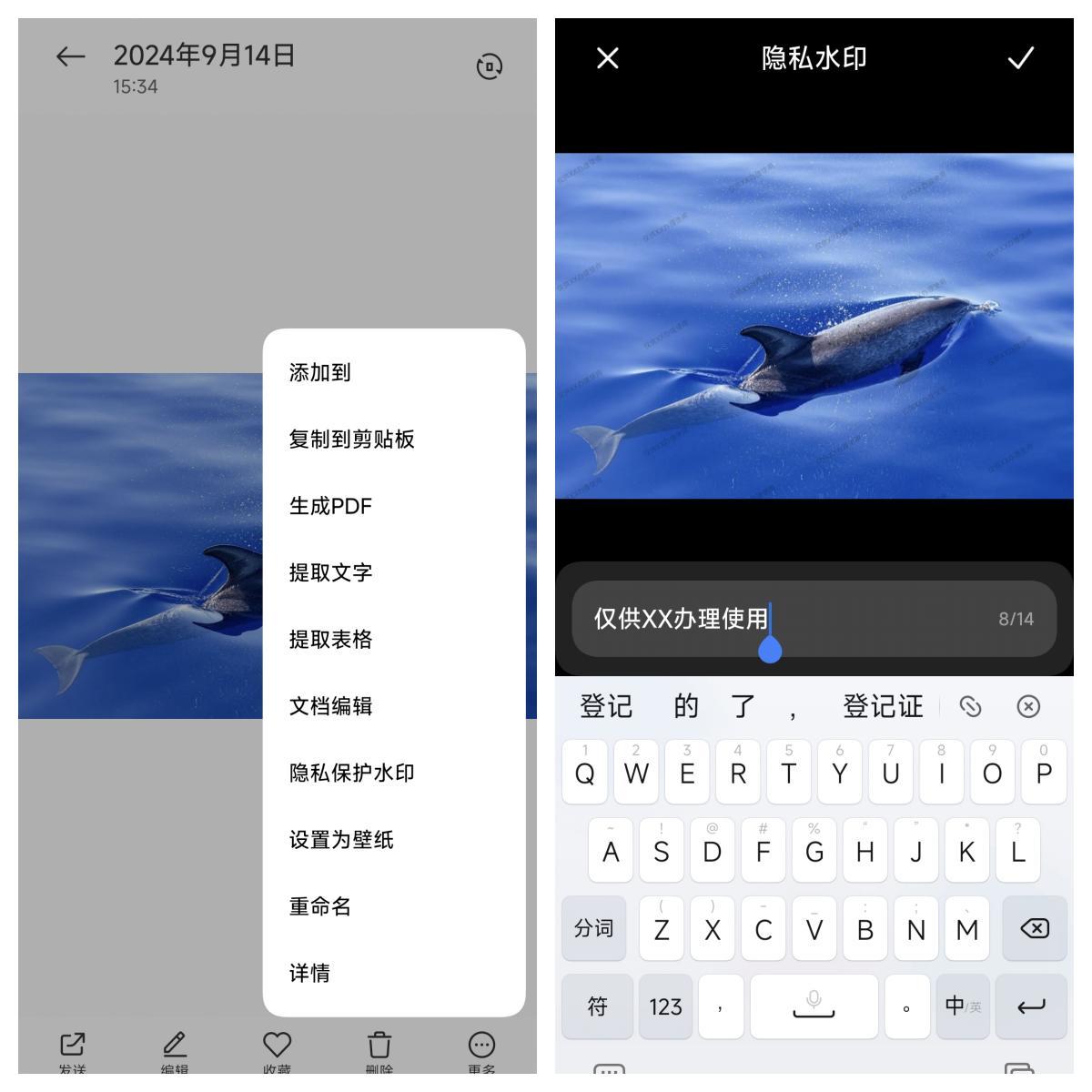 在相冊中找到需要加水印的身份證照片,點擊【文檔編輯】,添加隱私水印,自定義編輯水印內容,點擊“√”,保存即可,非常簡單。
