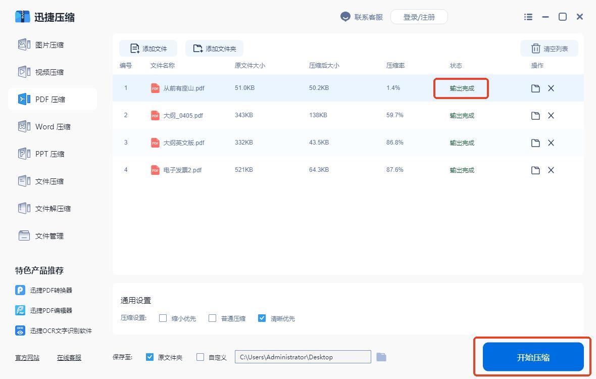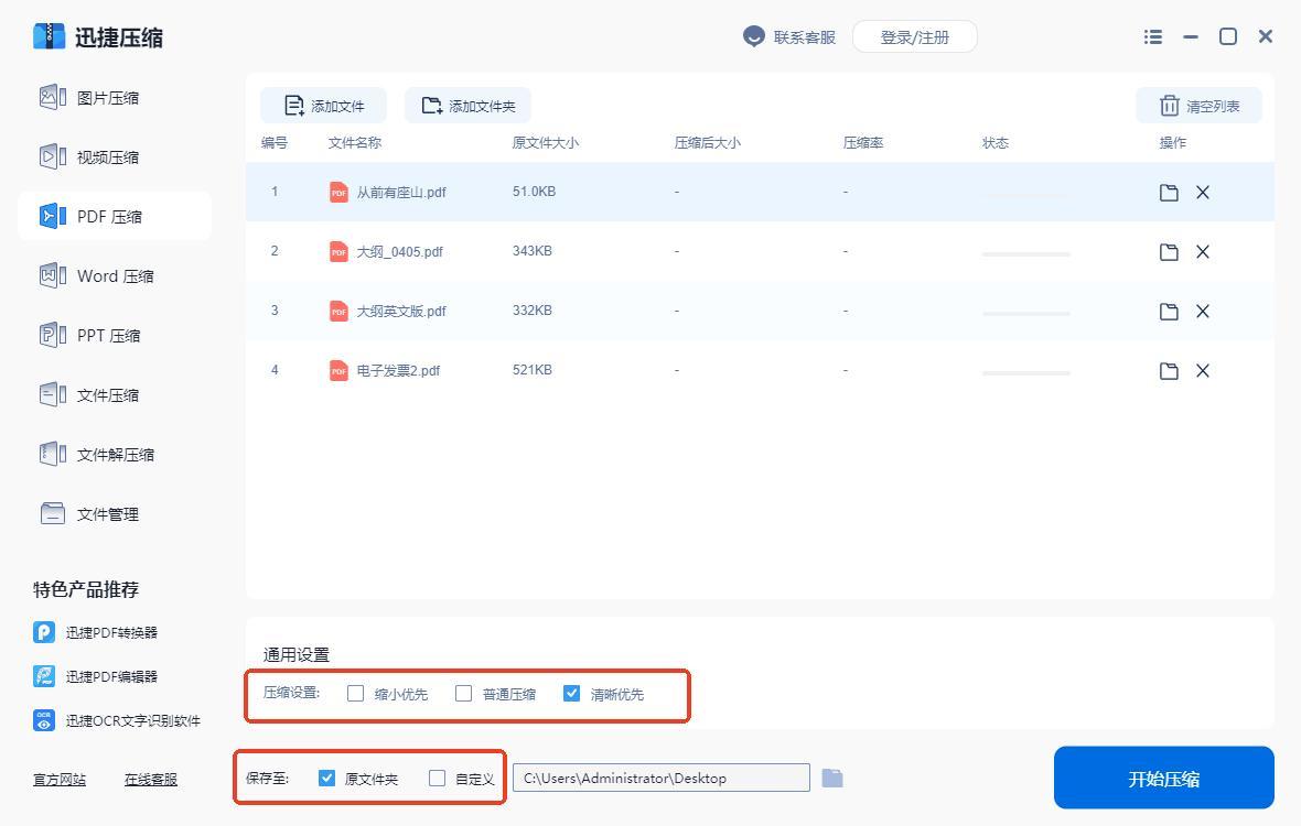 接着設置壓縮模式,例如縮小優先、普通壓縮和清晰優先,用戶可以根據需求來選擇需要的壓縮方式,還能自定義選擇輸出目錄。