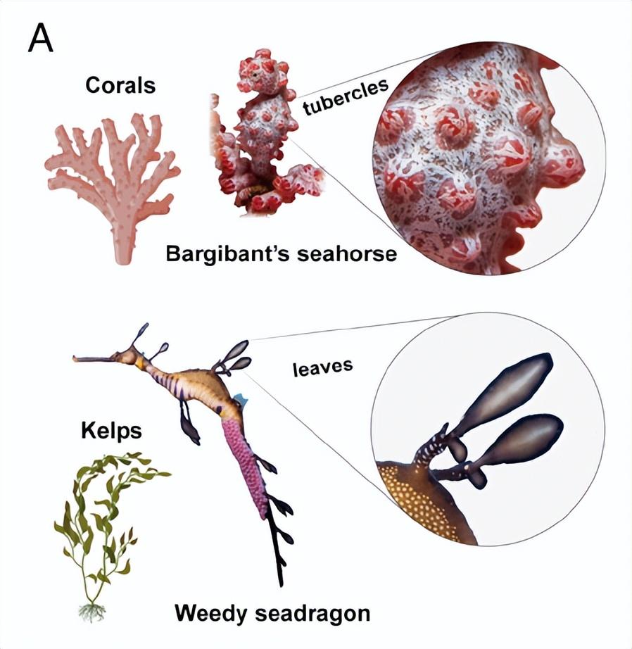 豆丁海馬 (上) 的瘤狀突起和雜草海龍(下)的葉狀附肢,分別增強了它們對柳珊瑚和海帶的擬態能力