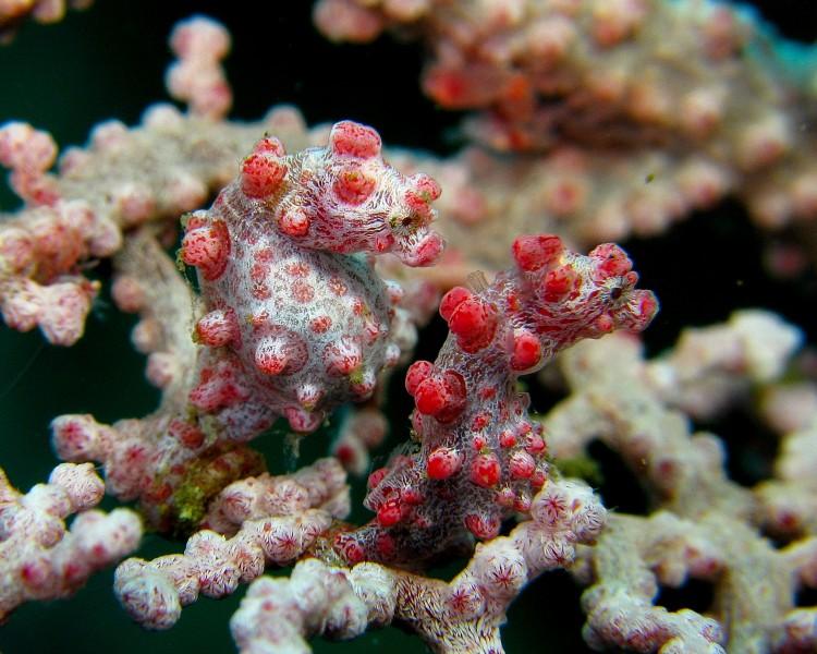而在海馬家族中,豆丁海馬稱得上是“迷你精靈”。它是世界上已知體型最小的硬骨魚之一,成年後全長僅有1至2釐米,比你的指甲蓋還小!別看它小,五臟俱全,形態也非常精緻。不同於普通海馬那修長的口鼻,豆丁海馬的口部短而鈍,彷彿保留了幼體階段的“稚嫩感”。科學家把這種特徵叫做“幼態持續”或“未成年化”的特徵,這種形態恰好讓它與柳珊瑚花狀突起的形態高度重合。粉色的體表、瘤狀的突起,使它與珊瑚枝叢幾乎無法區分,形成了近乎完美的僞裝。