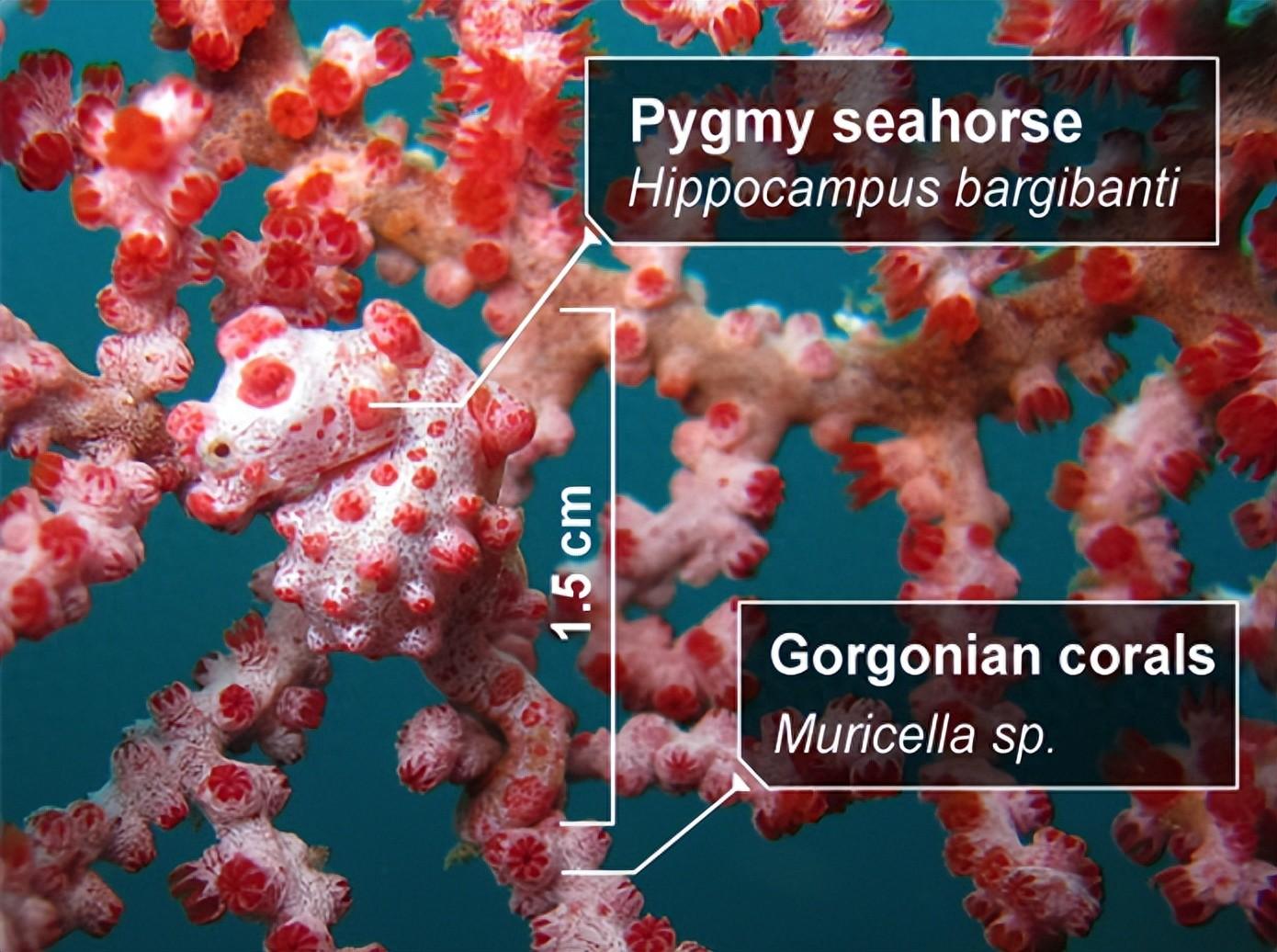 隱藏在柳珊瑚(Gorgonian corals)中的豆丁海馬(Pygmy seahorse),下方爲學名
