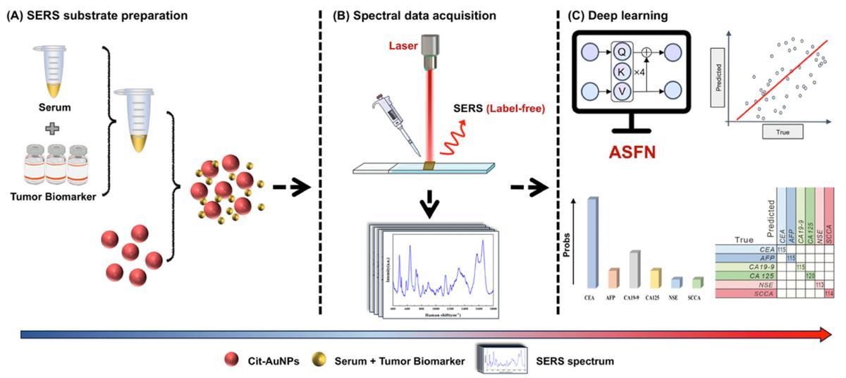 (A) 金納米顆粒的製備及其與樣品組裝用於 SERS 測量的示意圖;(B) SERS 光譜的採集;(C) 基於深度學習的腫瘤生物標誌物分類與濃度預測