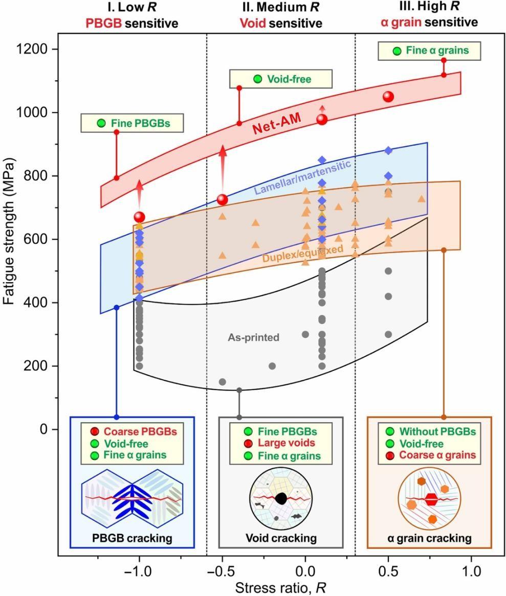 這三者共同構成了Net-AM鈦合金的“三重防線”,使其在不同應力比下均表現出卓越的疲勞抗性。實驗數據顯示,其疲勞強度不僅整體優於所有已知的鈦合金(包括鍛造和傳統打印),在比疲勞強度(疲勞強度/密度)方面更是優於所有金屬材料,包括鋼、鋁、鎂、高溫合金等。