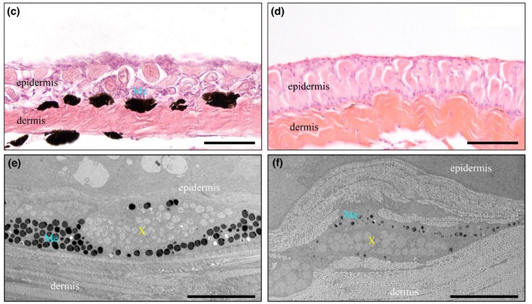 地表魚類細尾高原鰍(左)和洞穴魚類玫瑰高原鰍(右)皮膚的染色切片(c、d)和黑素細胞電鏡照片(e、f)