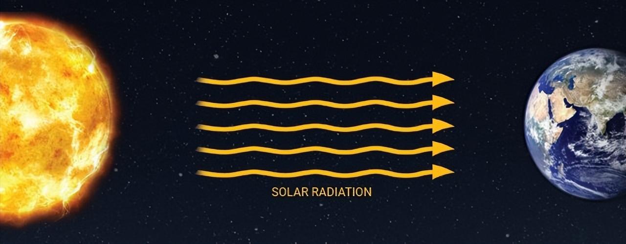 太陽輻射源於太陽上一直髮生的核聚變反應,這些能量主要以電磁波的方式向宇宙空間發射,理論上可遍佈太陽系,其中主要爲紅外輻射、可見光和紫外輻射,當然還有極少部分是X射線、極紫外等。其中,可見光和部分紅外、紫外可抵達地面,極紫外還有X射線等會被大氣層吸收。這些電磁波與地球上的粒子發生相互作用,比如照射到物體表面時,可增加粒子的動能,導致粒子運動速度加快,這種運動的增強所引發的結果就是溫度變化。
