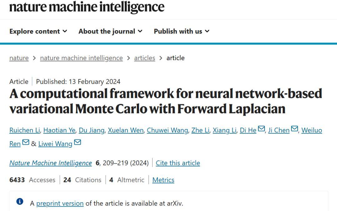 由此可見,NNQMC有巨大的潛力,唯一的缺點就是算得慢。其實它大部分計算量,都消耗在計算二階導數(即Laplacian)。字節跳動團隊對此設計了一套前向傳播計算框架,叫做Forward Laplacian,使NNQMC達到了十倍加速,從而能處理上百電子的體系[4]。這個框架已經廣泛被業界採用,例如谷歌DeepMind 2024年在《Science》發表的NNQMC工作中,就用到了Forward Laplacian。