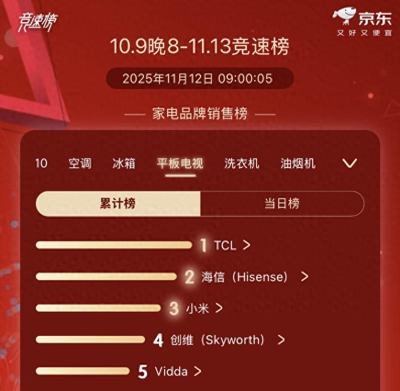 歷時一個多月的雙11狂歡終於落下帷幕,不知道大家有沒有刷到這份京東競速榜——TCL拿下雙11全週期電視銷量冠軍!這份成績並非偶然,早在今年前三季度,TCL就已斬獲國產品牌電視銷量桂冠,而且在全球市場上,它更是連續多年穩居電視銷量前二,旗下Mini LED電視更是連續兩年登頂全球銷量。