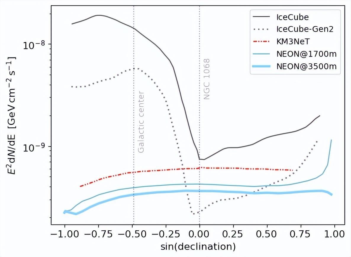 我們當前的研究表明,如果在中國南海的建設10立方公里的中微子望遠鏡——百川,我們將對高能中微子具有極佳的靈敏度,可以把鉀元素的輻射進行很好的排除,同時作爲靠近赤道的探測實驗,對全天的中微子都具有較好的探測效率,將在國際上處於領先地位(如圖3所示)。